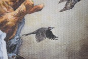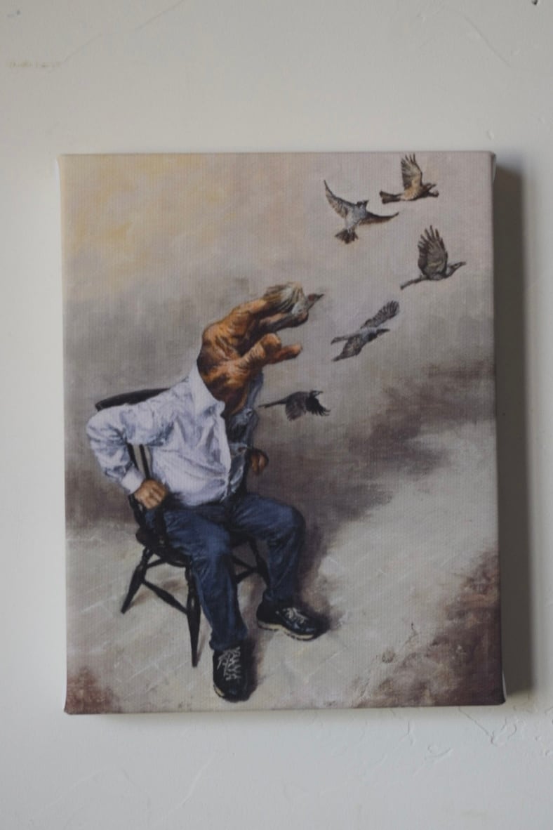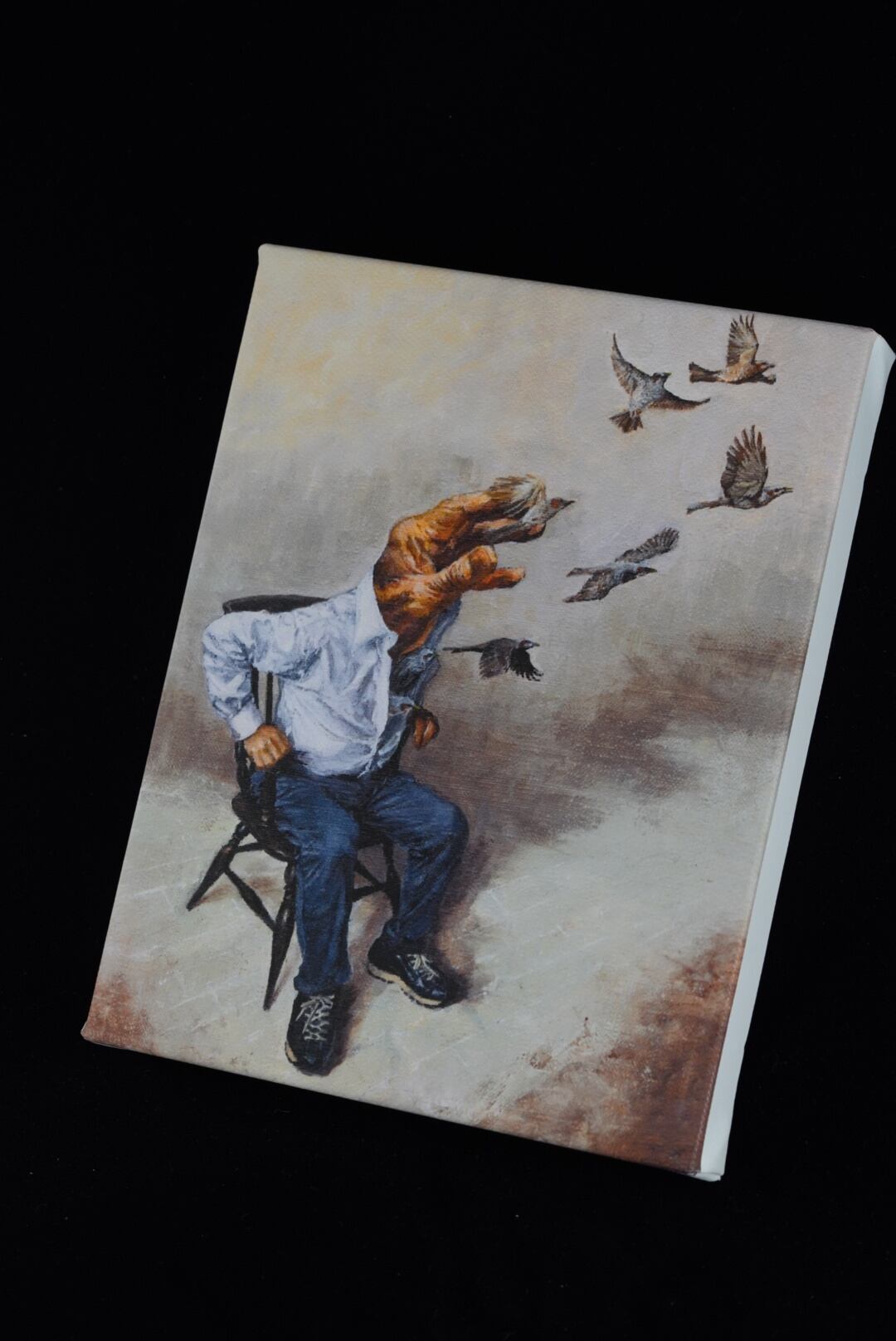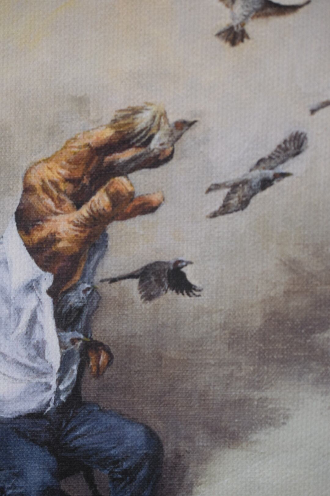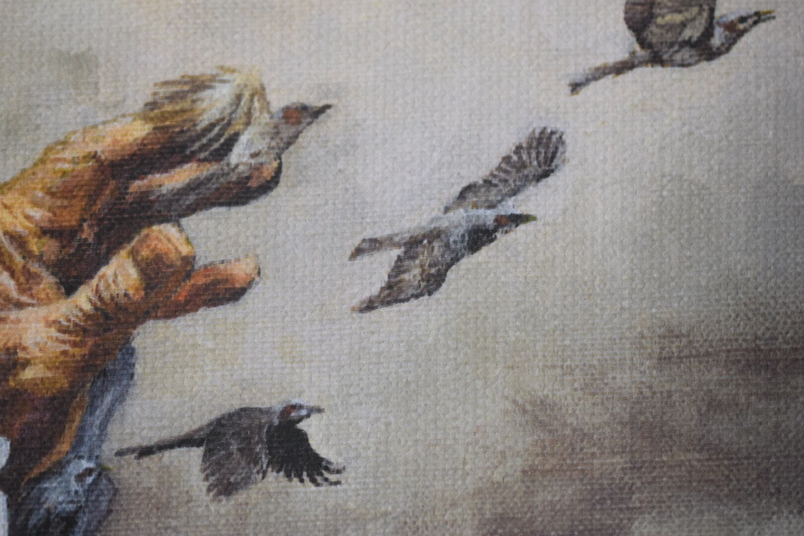 飛び去って行く小鳥たちはヒヨドリをモデルにしています。子供の頃からよく見かけて馴染み深い鳥です。
