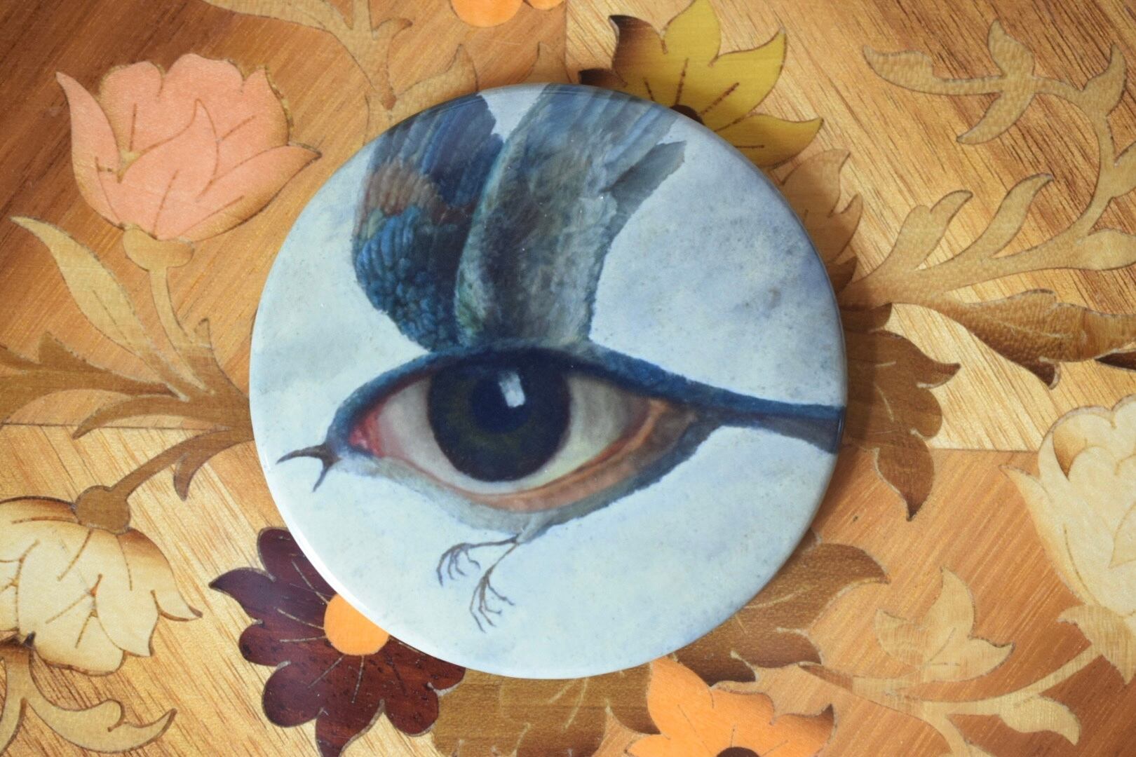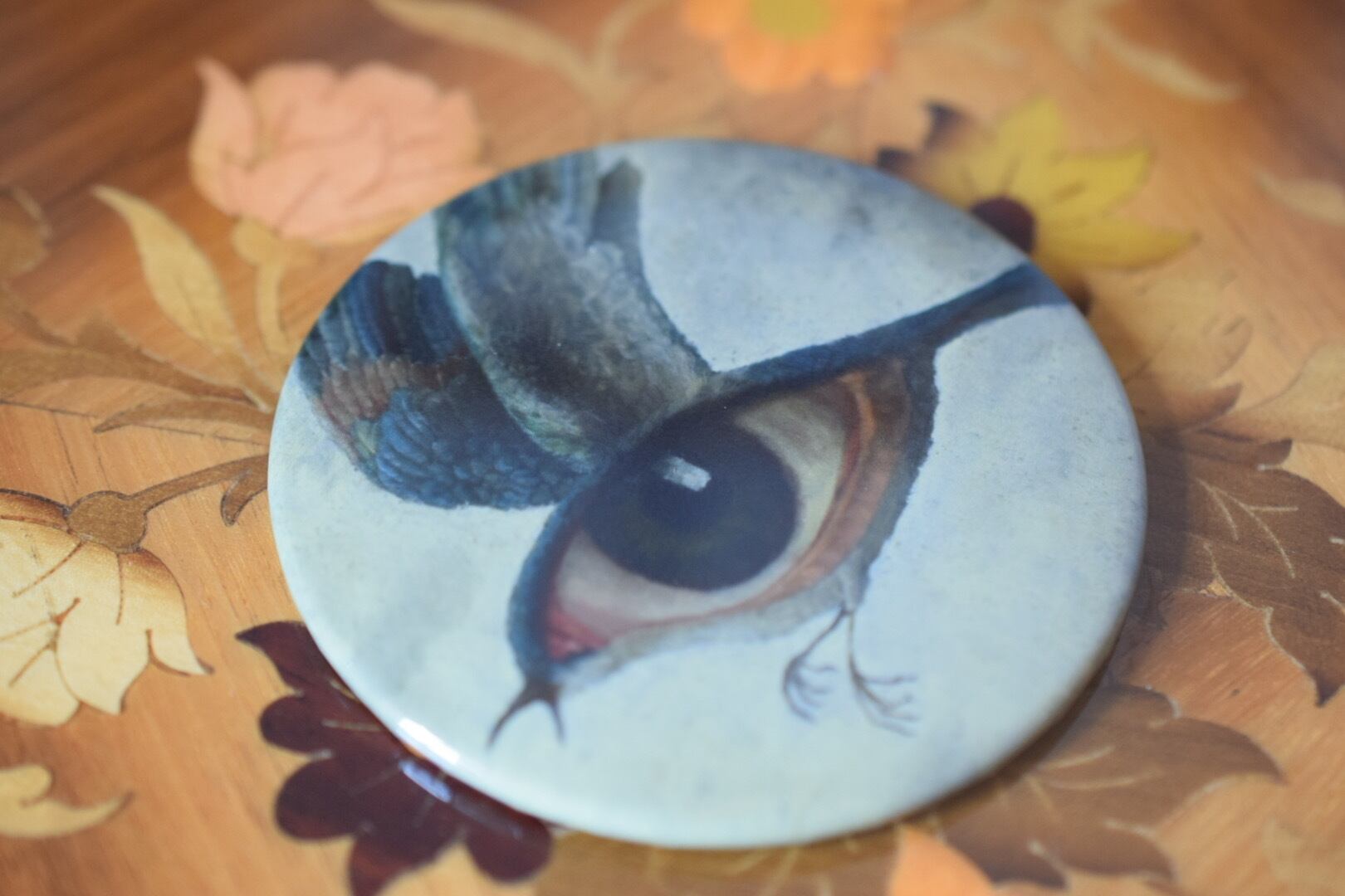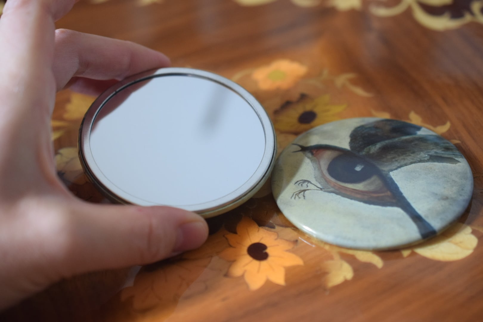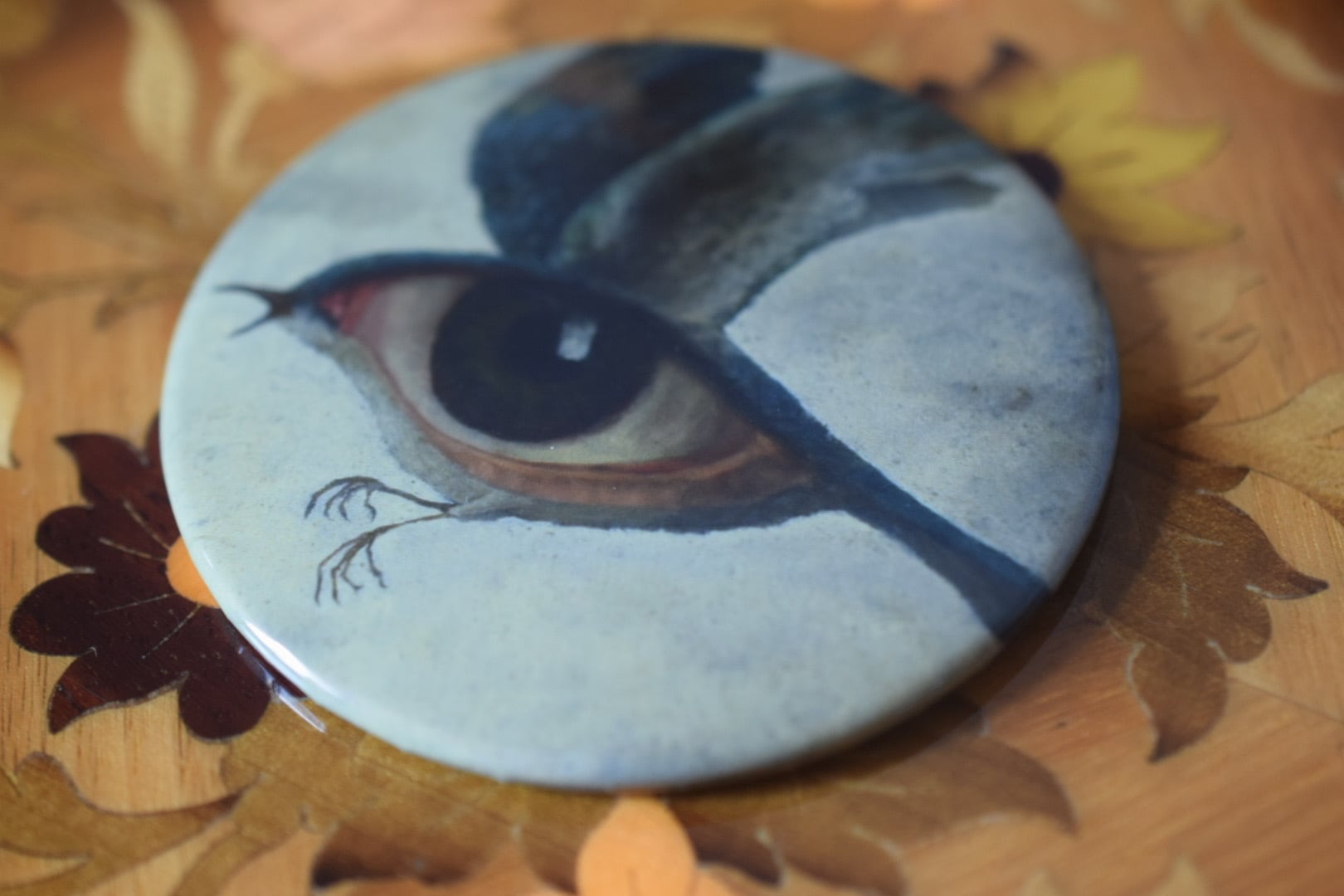直径76mmの丸い手鏡です。 作品名『目当て』 自分を戒め見張り見据え、見守る存在。私なりの御守りの絵。